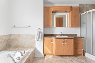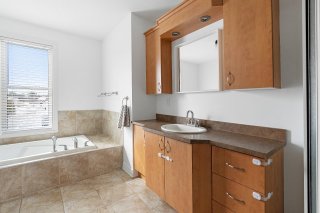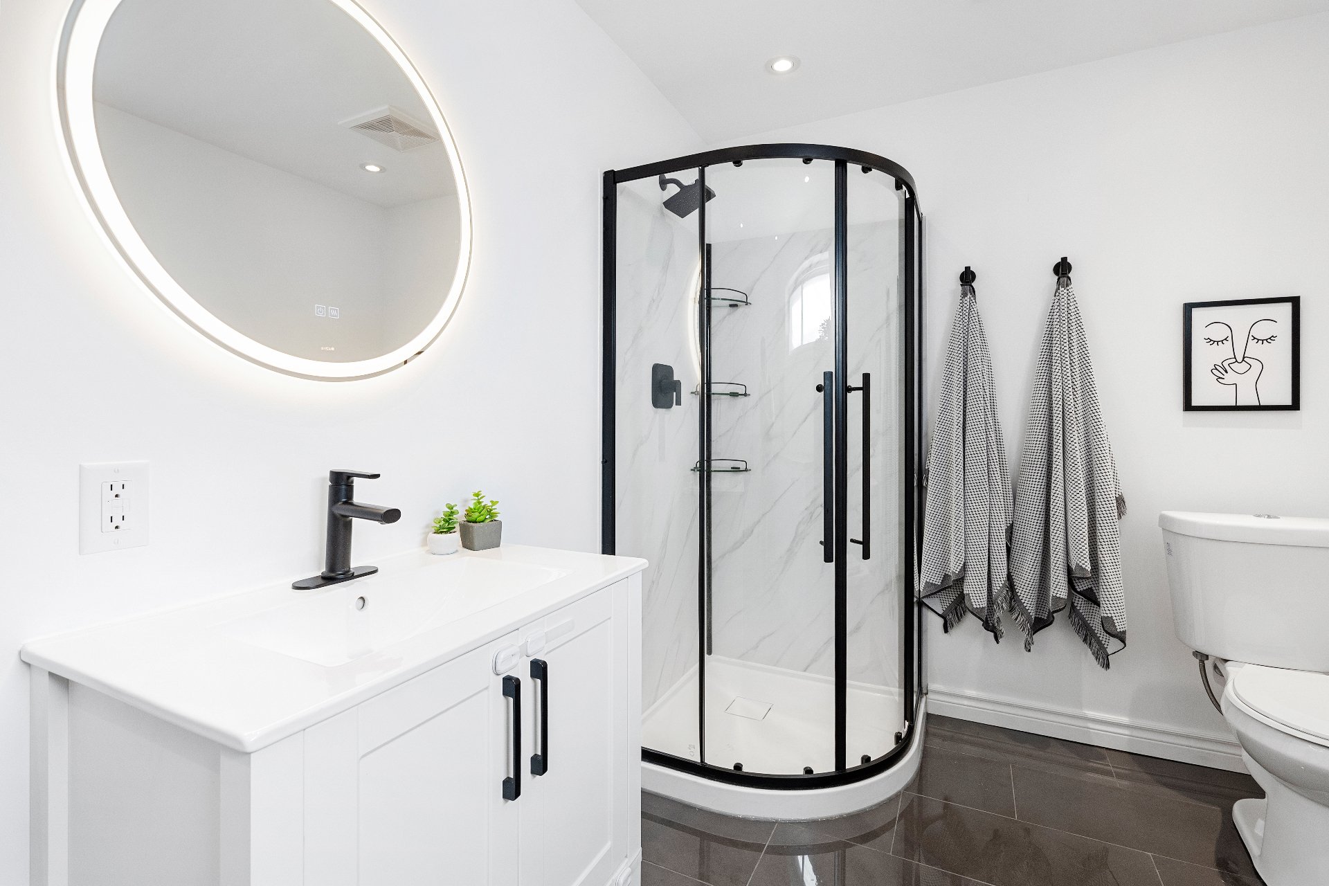 À l'étage, trois chambres à coucher de belles dimensions proposent des espaces confortables, idéals pour accueillir famille et télétravail. La salle de bain complète, dotée d'une douche indépendante, allie style et fonctionnalité.