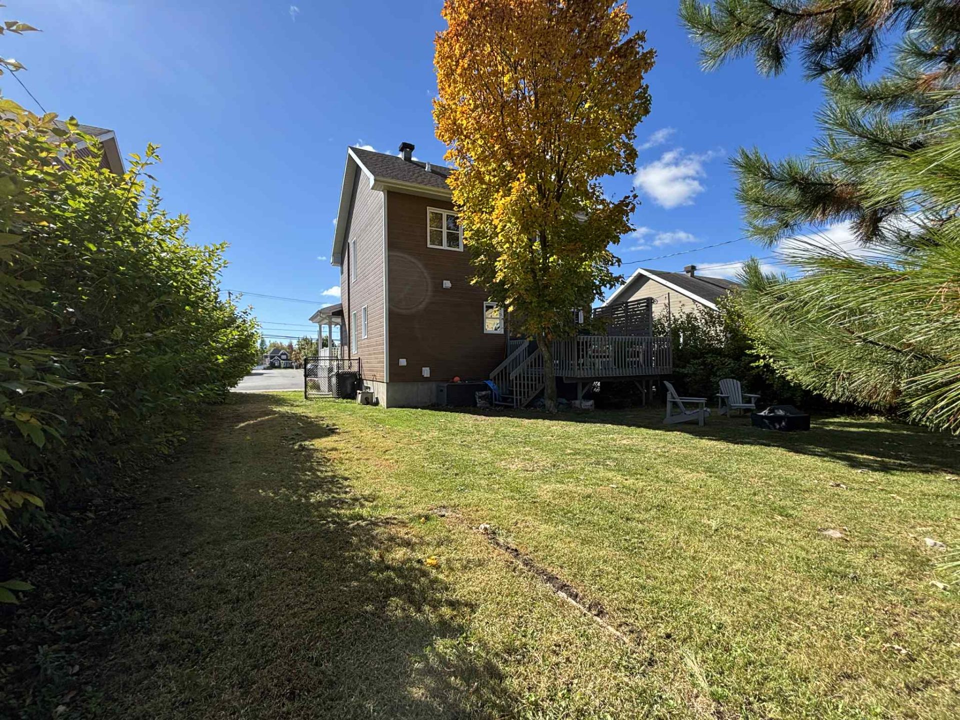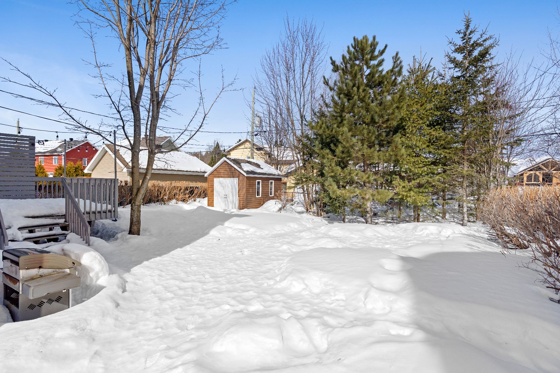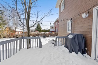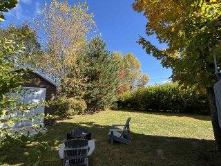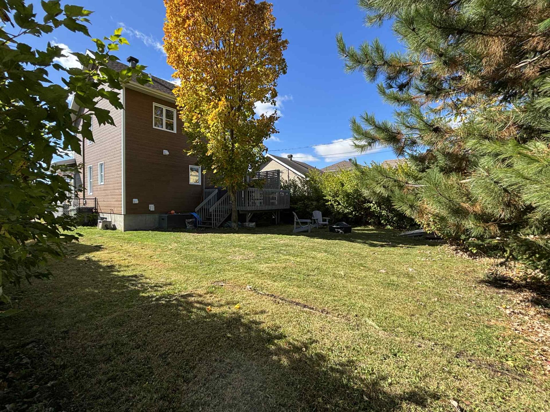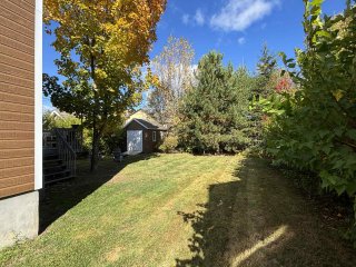 À l'extérieur, une cour soigneusement aménagée et entièrement clôturée offre un environnement intime et sécuritaire, sublimé par de majestueux arbres matures. La terrasse conviviale et le cabanon complètent cet espace pensé pour profiter pleinement des saisons.