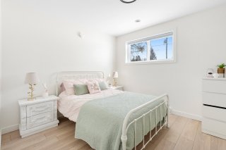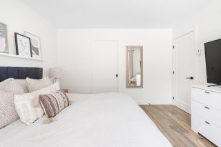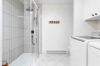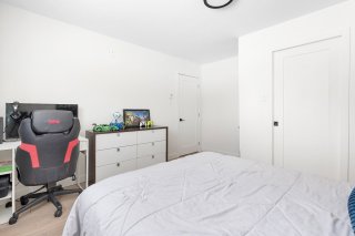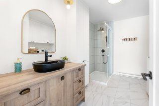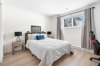 La chambre principale, de belles dimensions, profite d'une fenestration triple offrant une clarté exceptionnelle. La salle de bain, élégante, munie d'une douche indépendante, d'une installation laveuse-sécheuse et d'un plancher de céramique marbré, allie esthétisme et fonctionnalité.