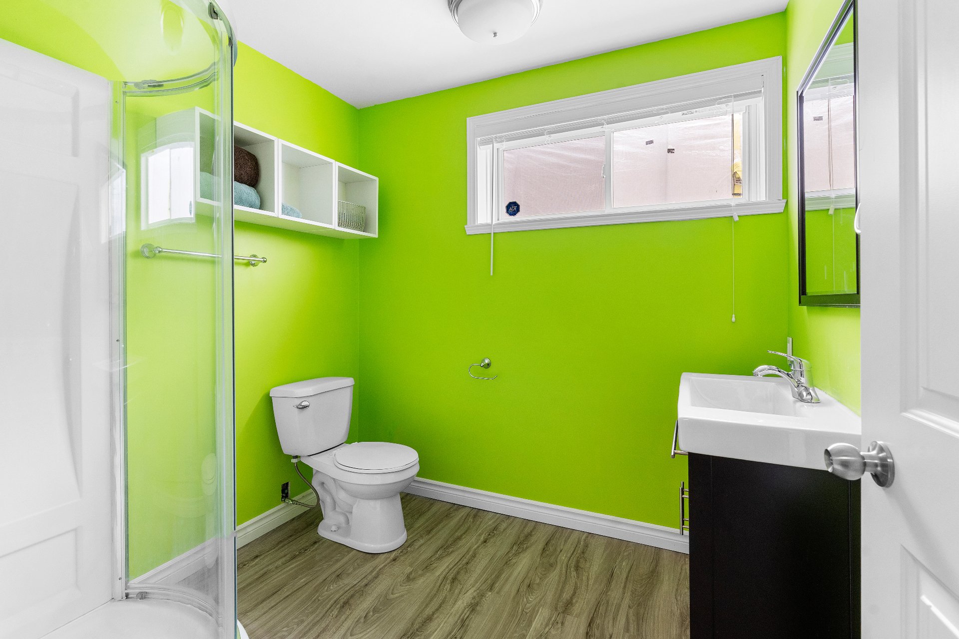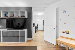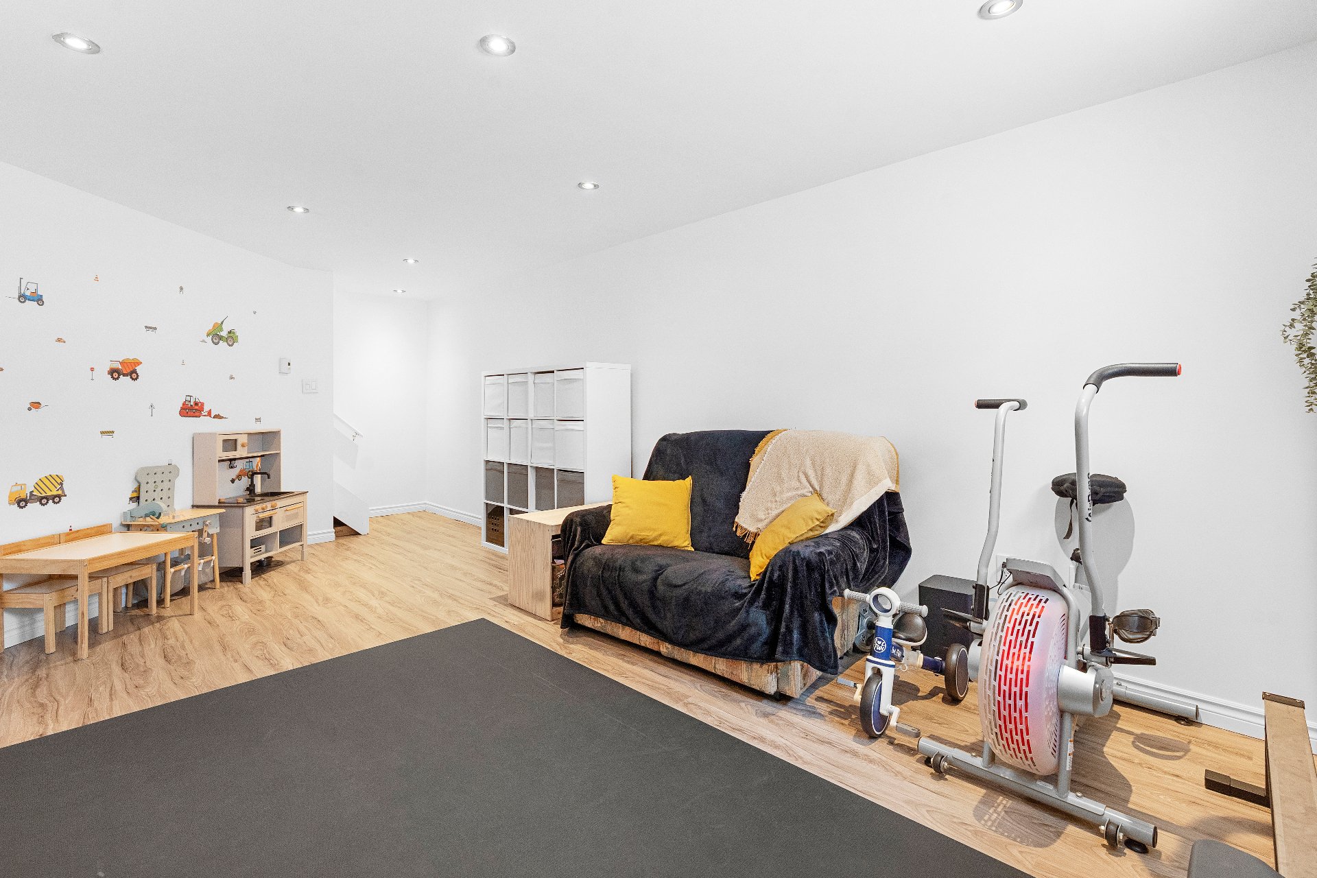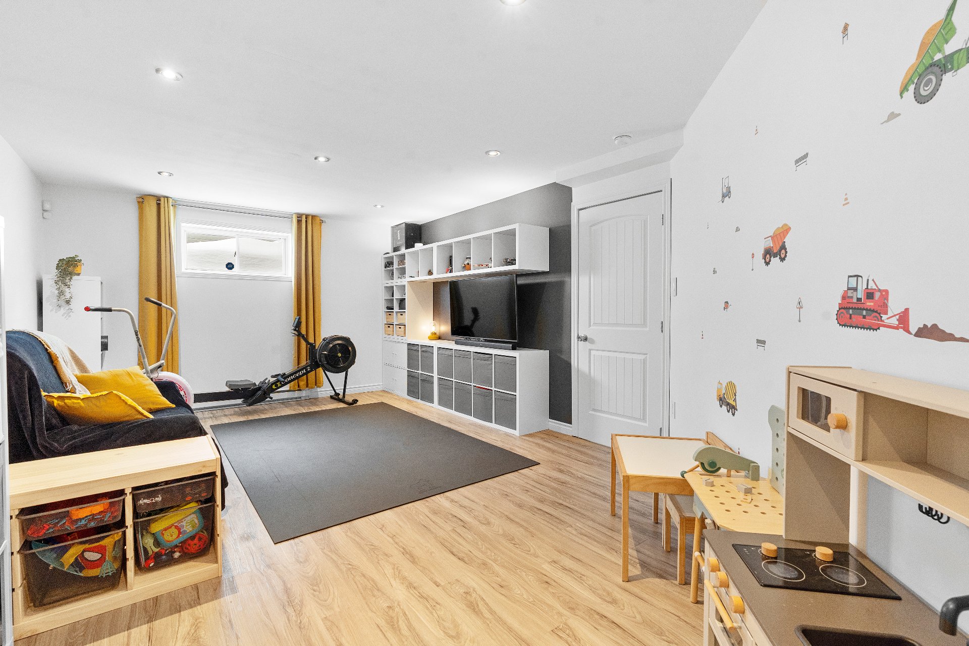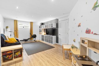 Le sous-sol entièrement aménagé propose une salle familiale polyvalente aux multiples possibilités, deux chambres supplémentaires de bonnes dimensions, une salle de bain complète ainsi qu'un espace de rangement sous l'escalier.