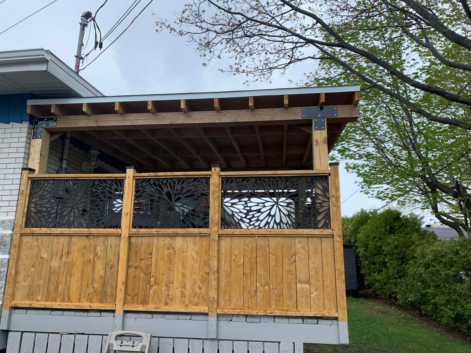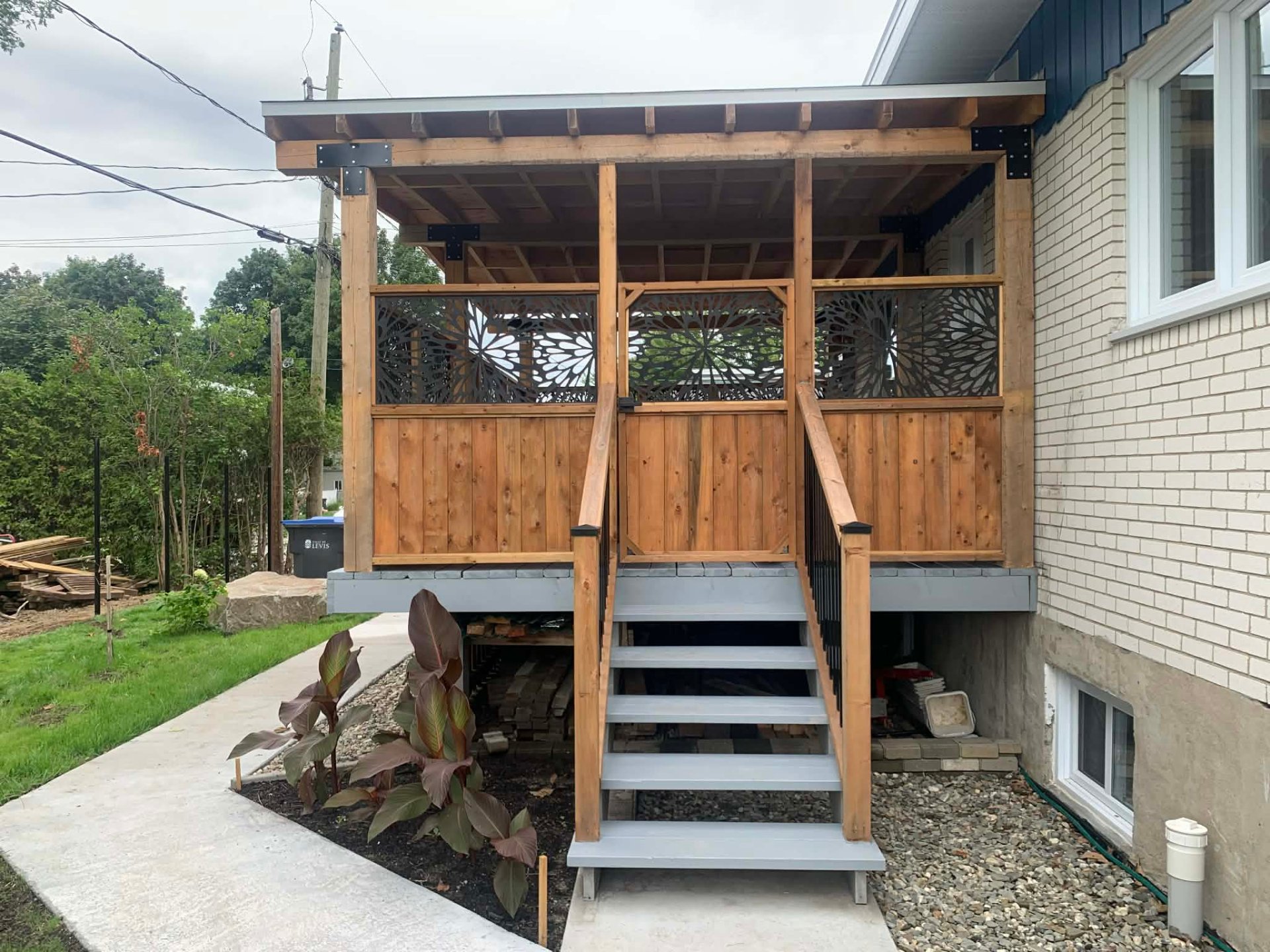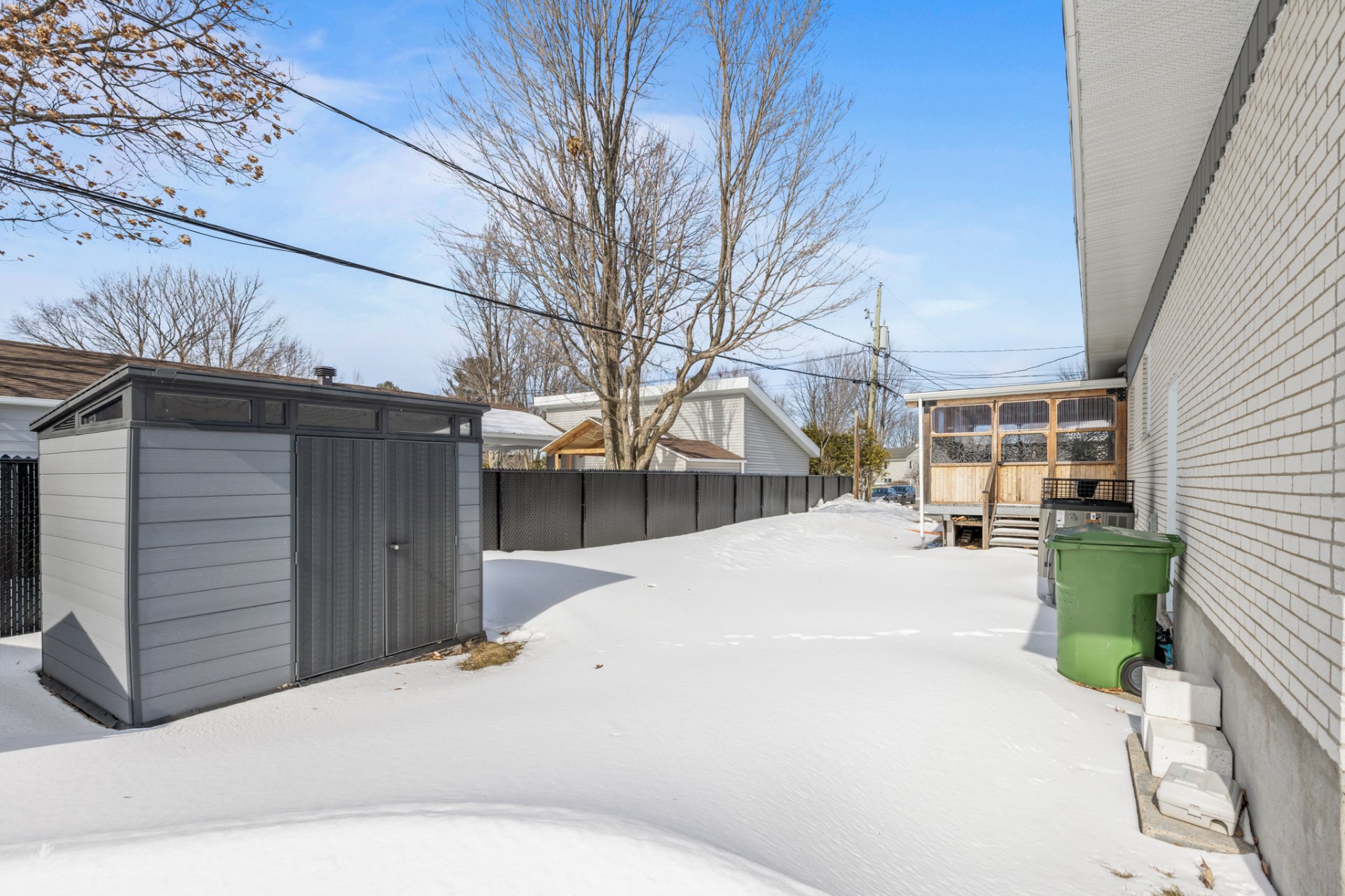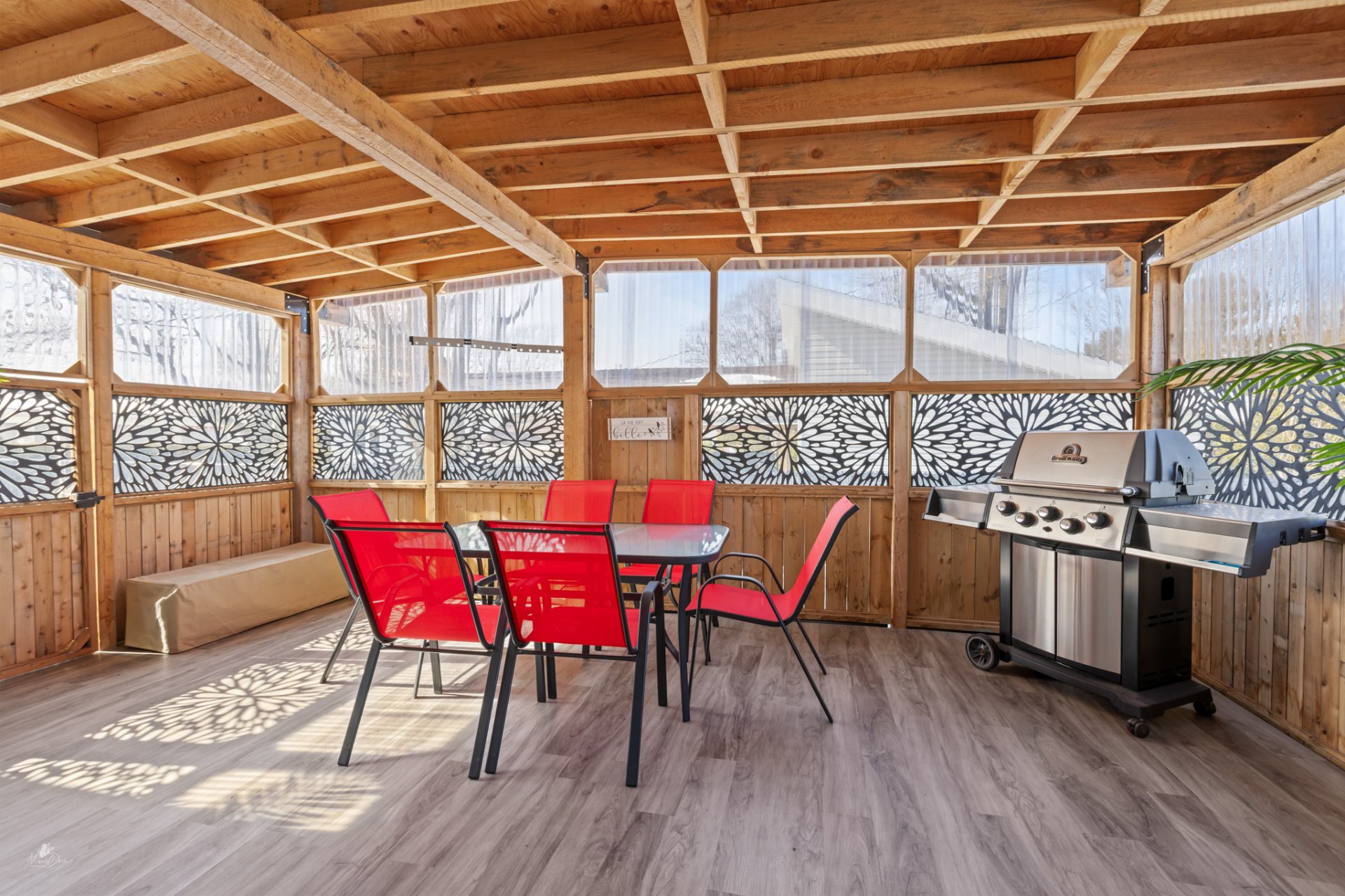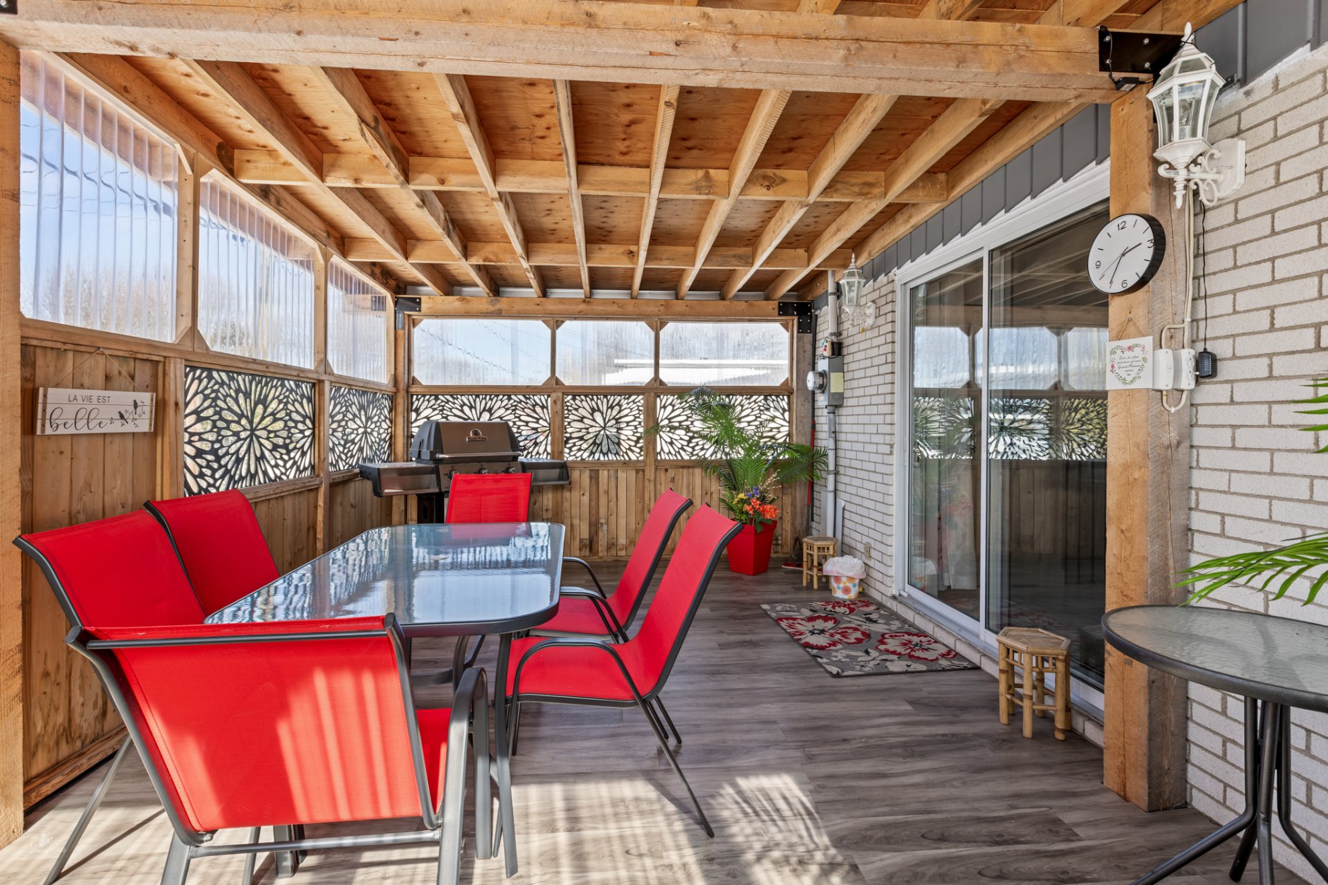 À l'extérieur, le patio couvert constitue un véritable atout, vous permettant de profiter pleinement des saisons dans un espace intime et fonctionnel, parfait pour les moments de détente ou les repas en plein air.