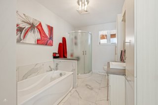 La propriété propose trois chambres à coucher de bonnes dimensions, idéales pour répondre aux besoins d'un jeune couple ou d'une famille en croissance. Les deux salles de bain, pratiques et bien aménagées, ajoutent un niveau de confort appréciable au quotidien.