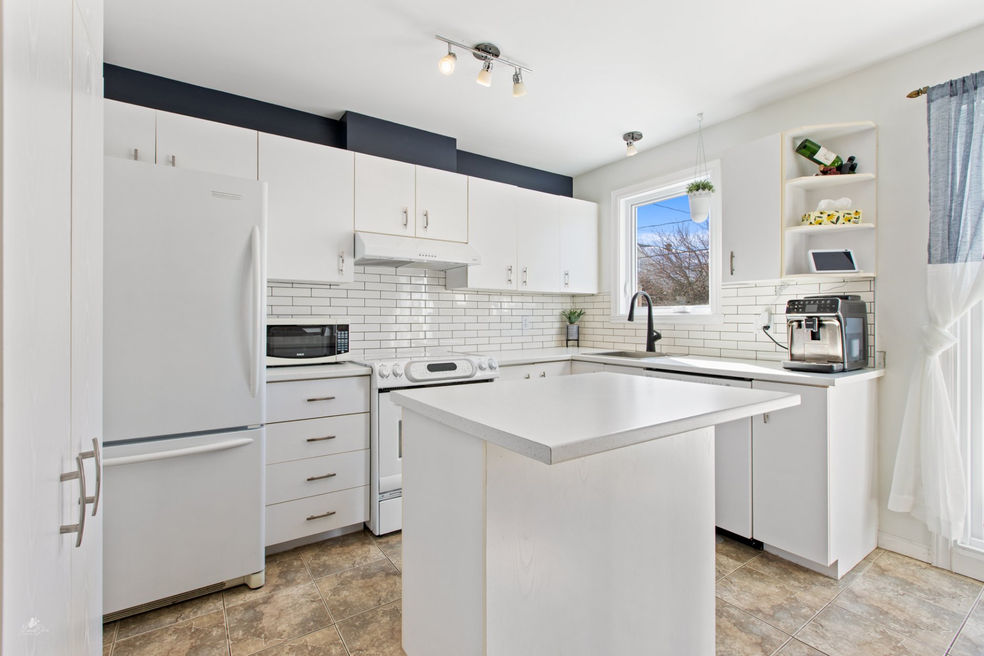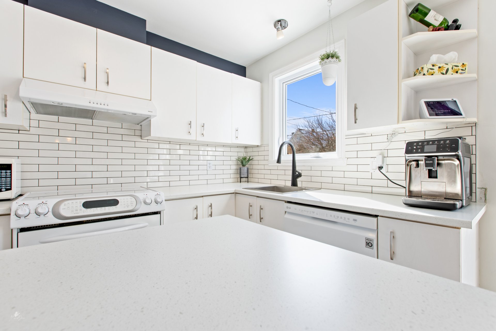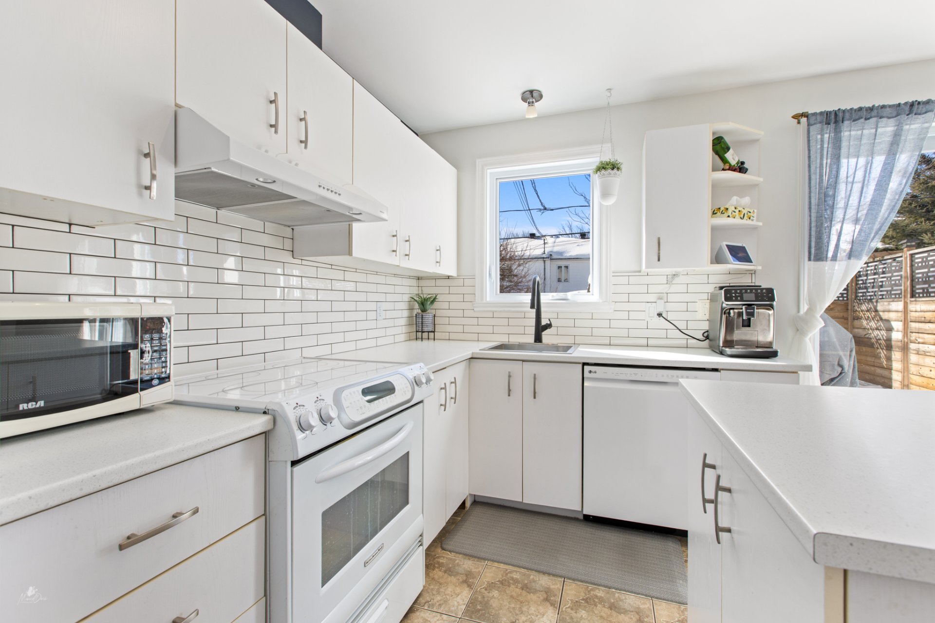 Inclus : Luminaires, habillage des fenêtres, balayeuse centrale et accessoires, lave-vaisselle.