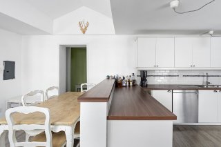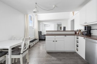 À l'étage, un espace de vie entièrement rénové vous accueille dans une atmosphère harmonieuse où le moderne s'allie à des touches plus chaleureuses. La cuisine, véritable coeur de la maison, séduit par ses matériaux de qualité supérieure, ses nombreux rangements et son ouverture fluide sur la salle à manger, créant un environnement lumineux et convivial. Le salon, spacieux et élégant, offre de multiples possibilités d'aménagement.