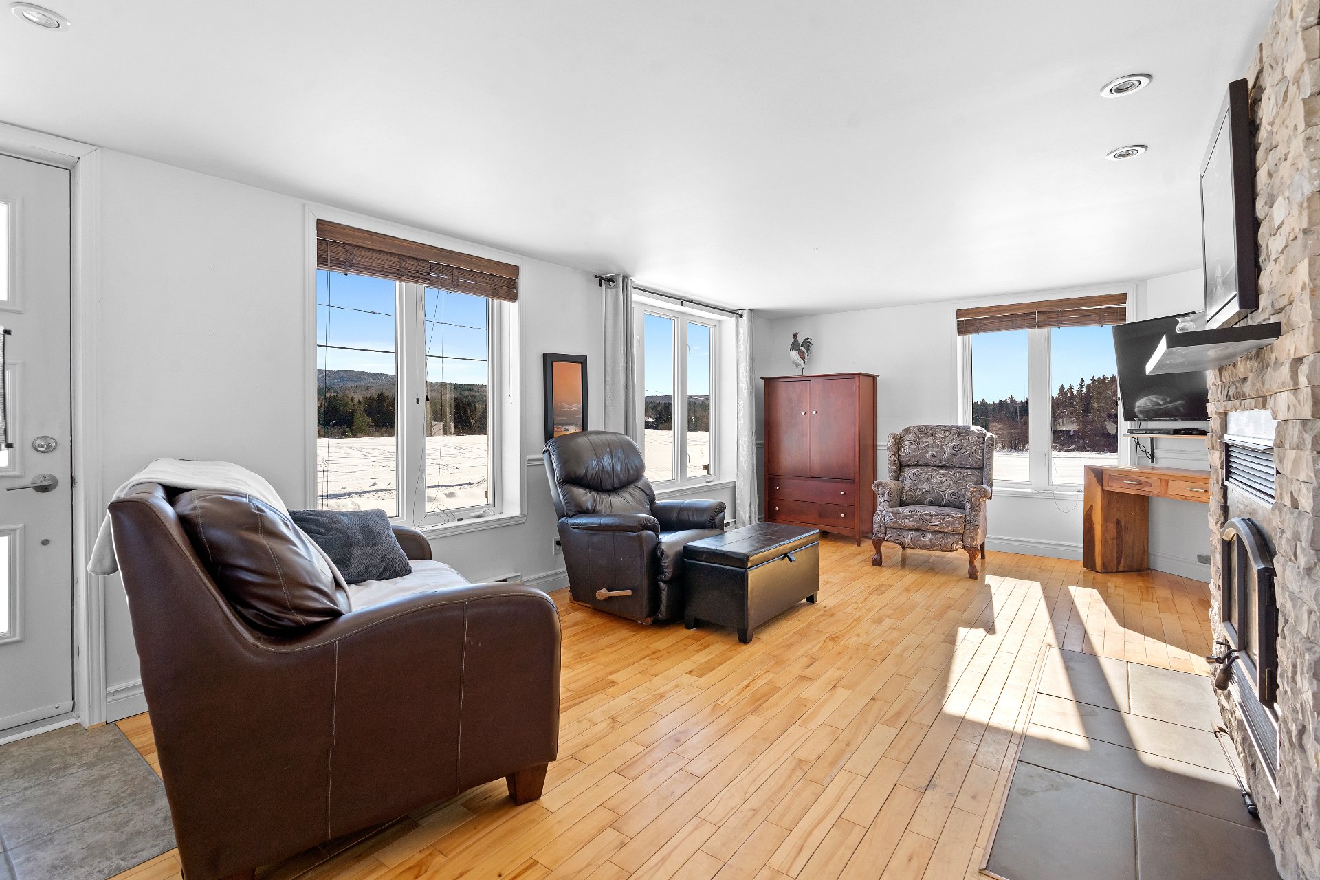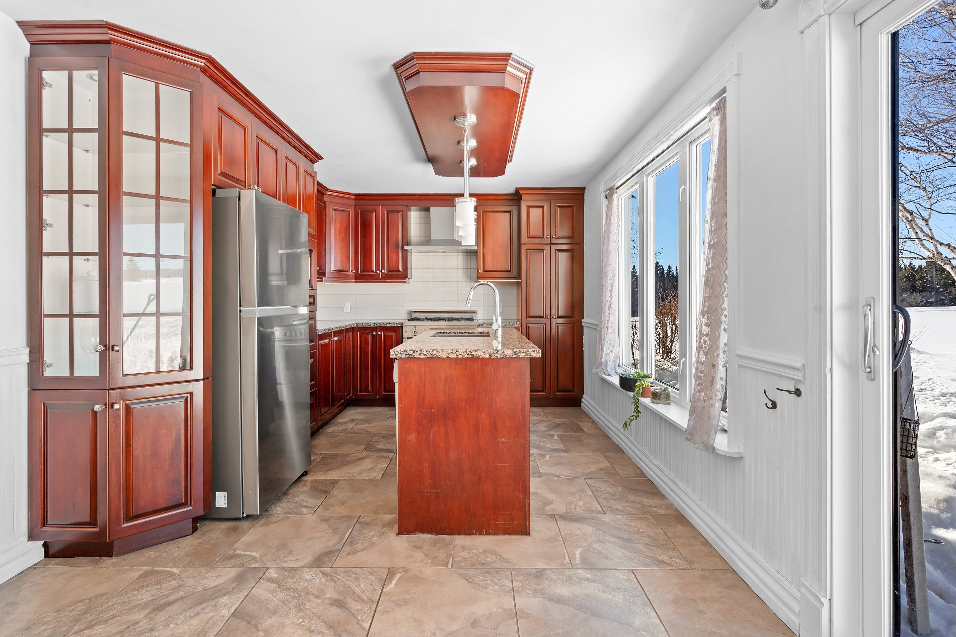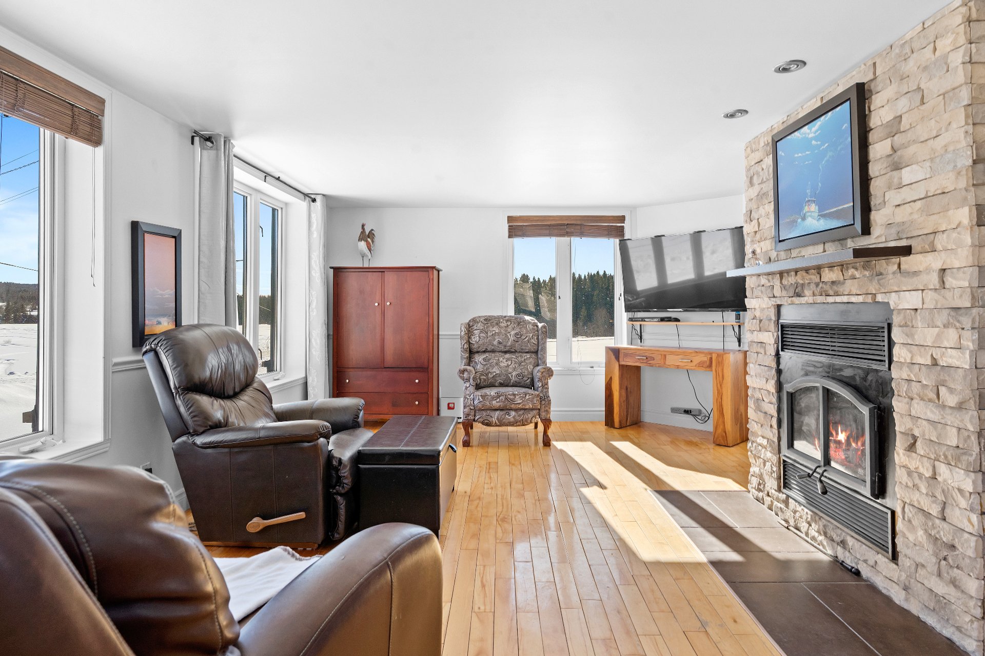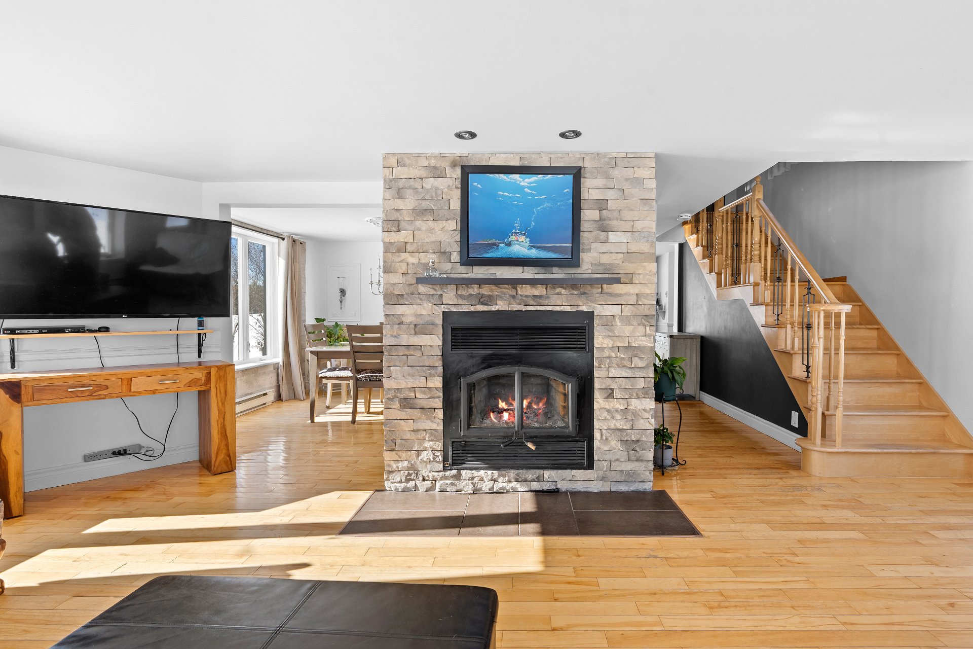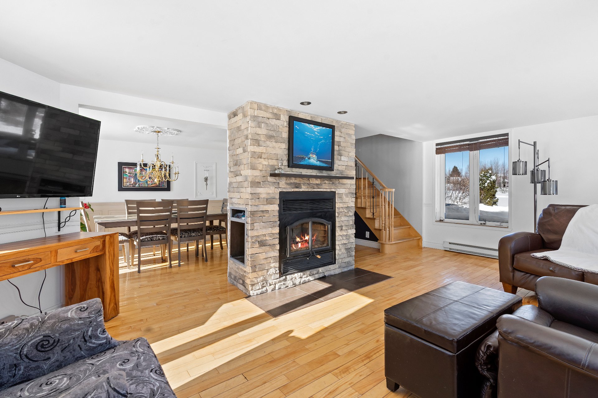 Cette propriété de style aire ouverte est baignée de lumière naturelle. Dès l'entrée, le salon vous accueille avec un magnifique foyer au bois dégageant confort et élégance. La salle à manger s'intègre harmonieusement à l'espace et mène à une grande cuisine aménagée de façon stratégique, offrant une abondance de rangement et un vaste plan de travail.